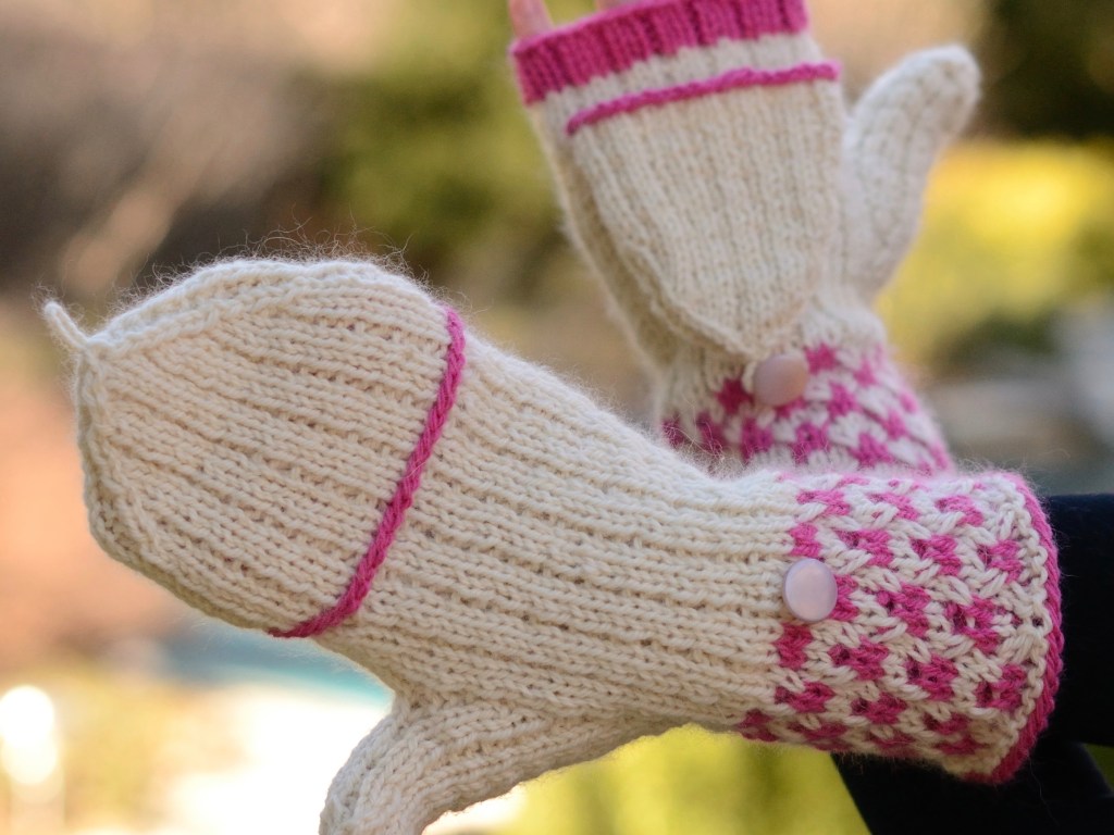 A ribbed, flip-top mitten with a simple color-work cuff.