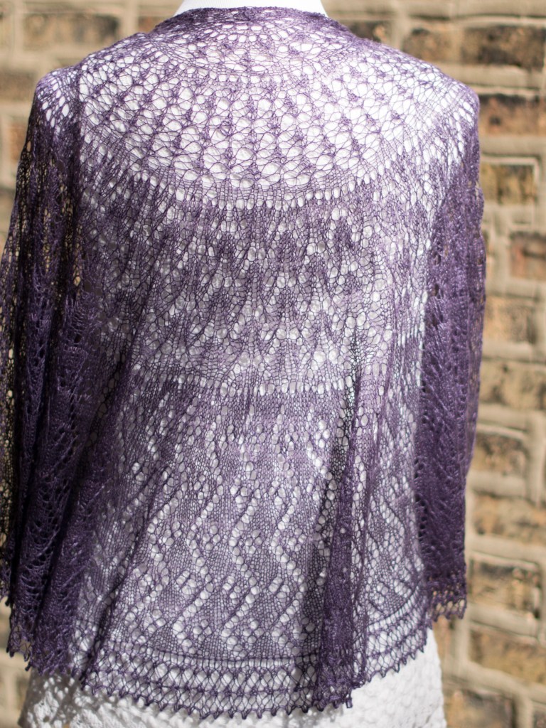 A ¾ circle shawl with three different lace sections and a knitted on border. Knit from the top (neck) down, the shawl can easily be made larger or smaller by altering the number of repeats in the last section. The ¾ circle shape creates more width for wrapping around the shoulders.