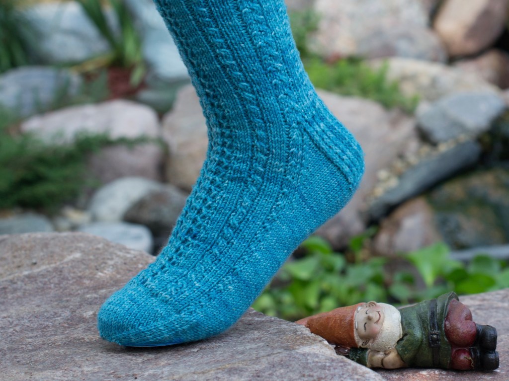 Simple cables and rib are combined to create a great fitting sock, while the unusual lace stitch running down the front and back add a bit of flair.